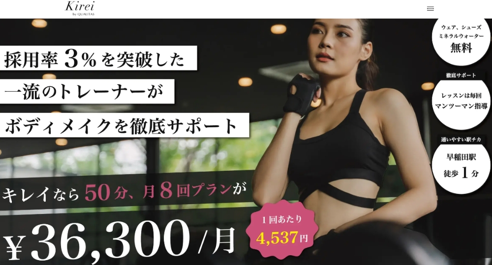 Kirei by QUALITAS早稲田店は、神楽坂にあるパーソナルジム。1回50分で、8回分のレッスンは72,600円(税込)。はじめての方は5,500円(税込)でパーソナルトレーニングの体験を受けることができます
