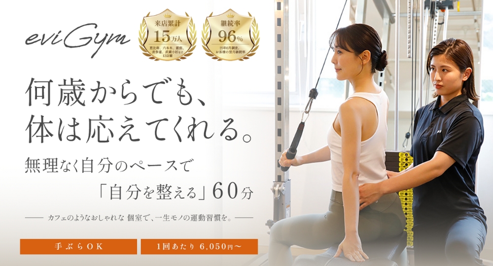 eviGymはきつい運動は続かないと思っている人におすすめのパーソナルジム。カフェのような明るい空間でまずは身体を整えてトレーニングをします。普段気づきにくい姿勢や動きのクセを丁寧にチェックし、あなたに合った無理のない方法でサポート。1回60分、8回分の料金は57,200円(税込)と通いやすい価格でリピーターから支持されています◎。まずは初回体験へどうぞ