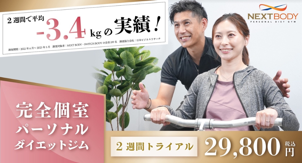 NEXT BODYは広島にあるダイエット特化型のパーソナルジム。2ヶ月で平均-7~8kgの減量実績のある食事指導で選ばれています。2週間トライアルコースは「3食食べて本格的に痩せるダイエットメソッド」が習得できるので大人気です。料金は55分×4回で29,800円(税込)とコスパ◎。TV番組や全国雑誌で紹介されたプロのダイエット指導に興味がある方はこちらへ