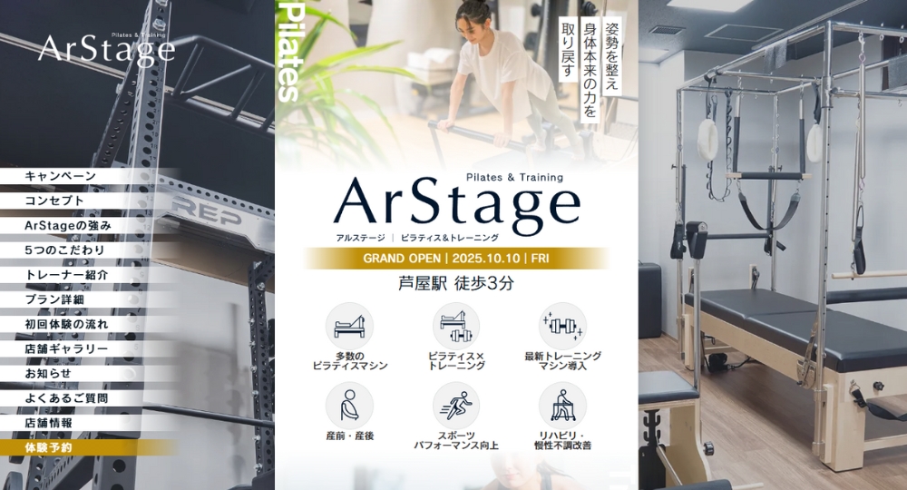 ピラティス&トレーニング ArStage(アルステージ)は、芦屋にあるパーソナルジム。1回50分で、月8回のサブスクプランは56,000円(税込)。はじめての方は5,000円(税込)でパーソナルトレーニングの体験を受けることができます