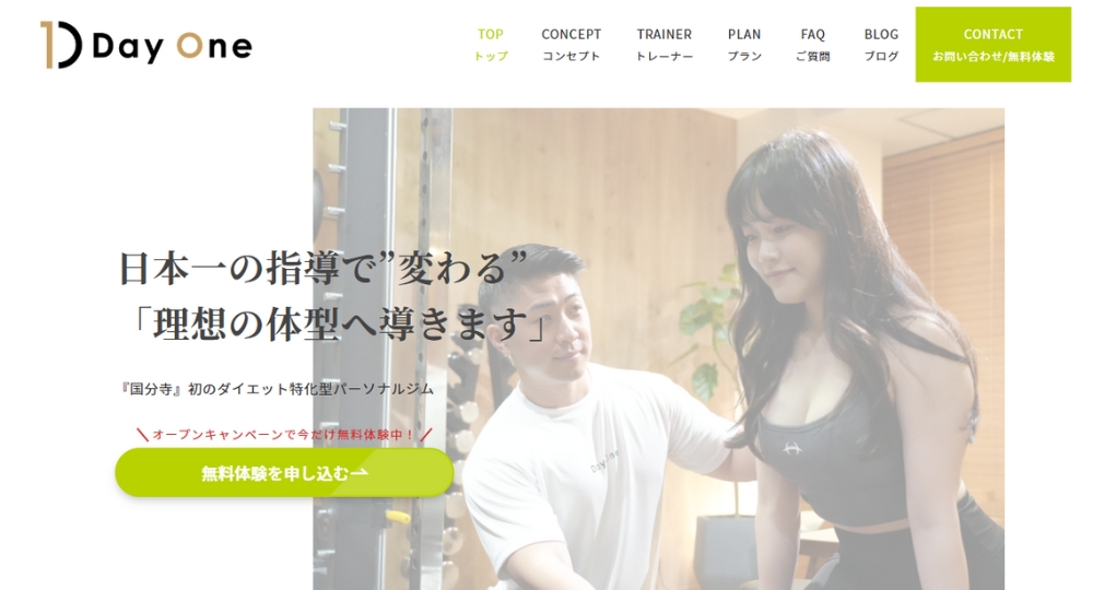 Day Oneは、国分寺にあるパーソナルジム。1回55分で、10回分のレッスンは88,000円(税込)。はじめての方は5,000円(税込)でパーソナルトレーニングの体験を受けることができます