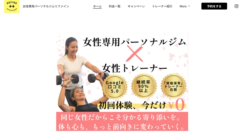 女性専用パーソナルジムリファインは、相模原にあるパーソナルジム。1回60分で、16回分のレッスンが129,800円(税込)。はじめての方は1,980円(税込)でパーソナルトレーニングの体験を受けることができます